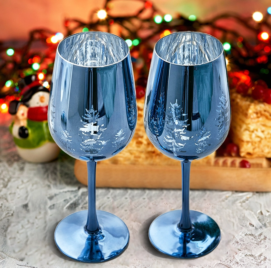 Ring in the Holiday Season with this unique Christmas Wine Glass Set of 2. Featuring two blue wine glasses with a beautiful winter wonderland design, it's the perfect drinkware to celebrate the happiest time of the year! Perfect for anyone who loves the holiday season or winter!
