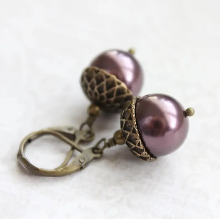 These are beautiful modern autumn earrings with pearl acorn drops! These earrings are glass pearls and the acorn top is antique brass. These drops have a lovely simplicity with lots of detail! The perfect nature inspired dangle earrings for any season!