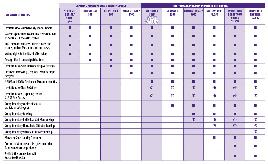 The largest part of our permanent collection originated with the Evangeline Bergstrom paperweight collection and consists of over 4,000 objects. Includes all the General Member benefits PLUS benefits at over 1,200 museum throughout North America.